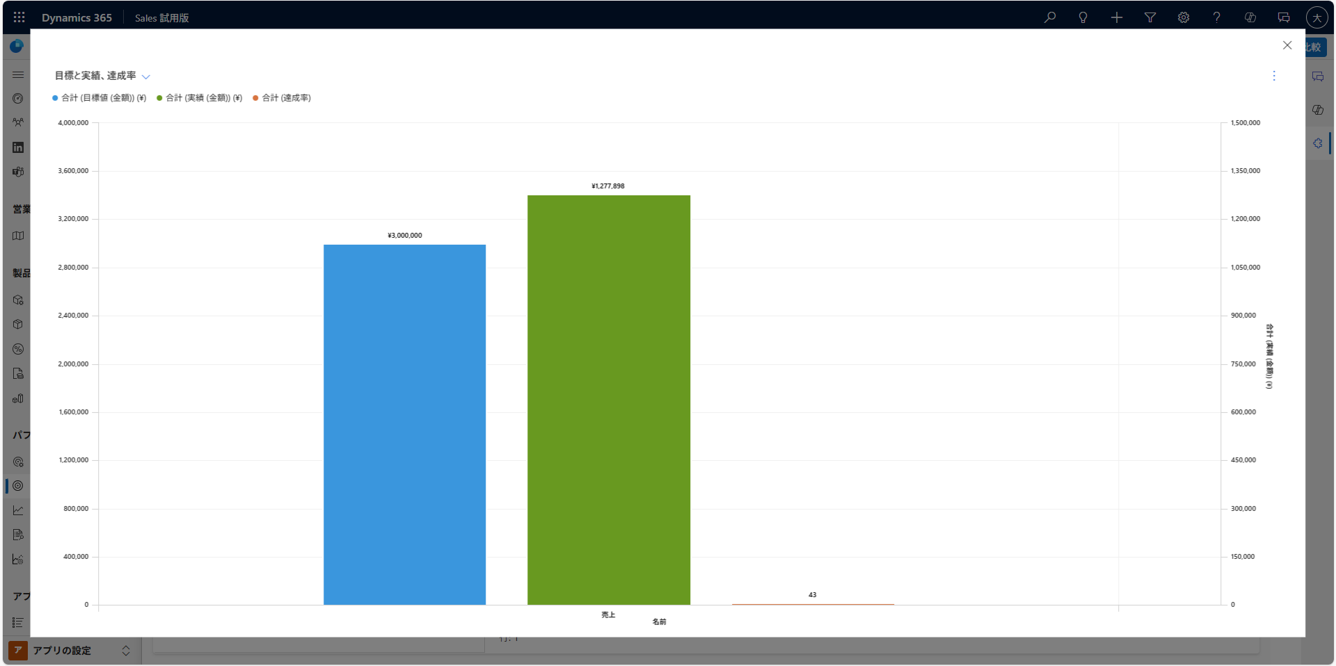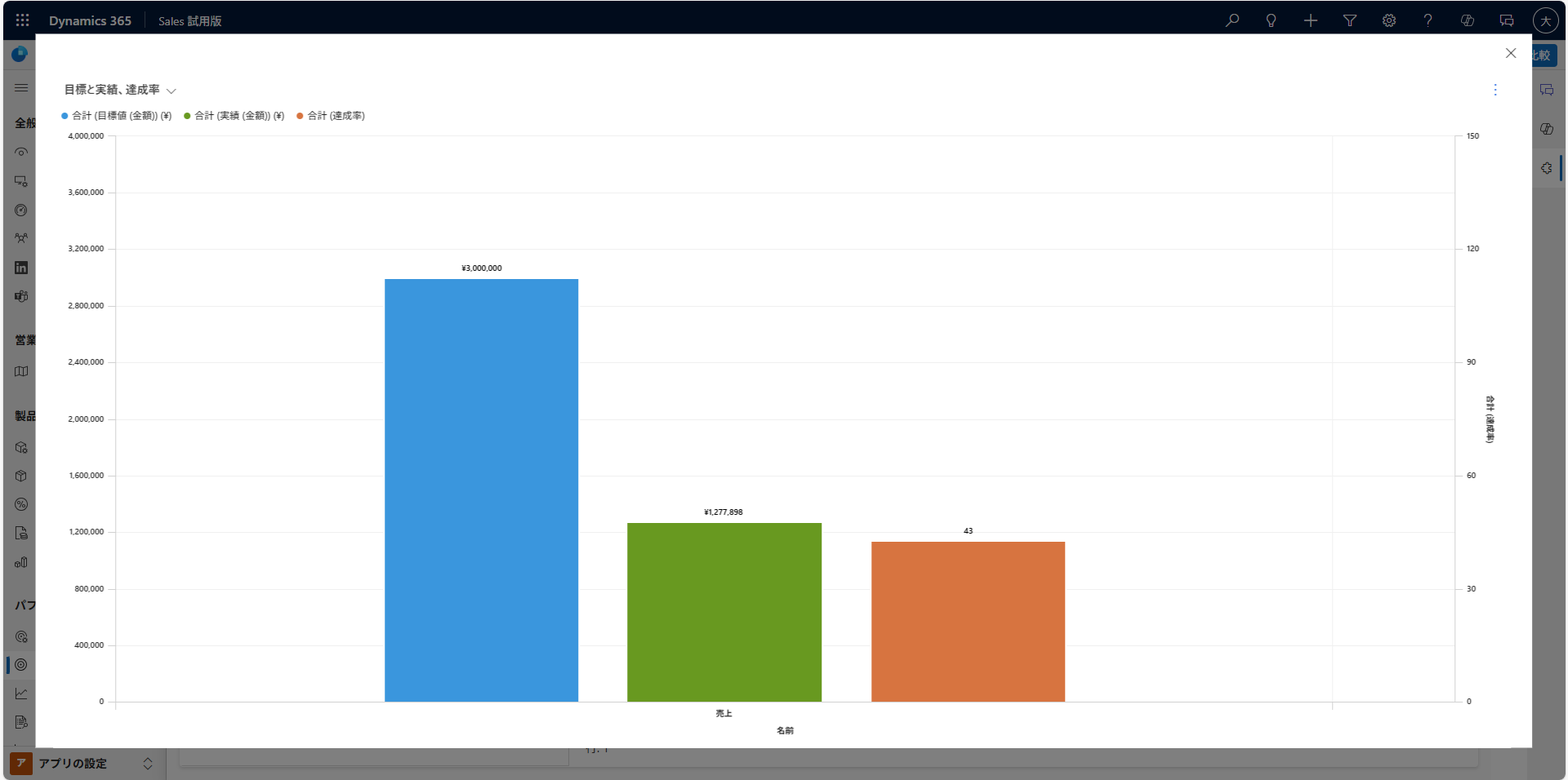This is a three-axis graph created for the sales team, showing "target amount," "actual amount," and "achievement rate."