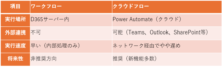 With Cloud Flow, you have to be aware of unnecessary external connections and API restrictions, but with Workflow, you can complete the process within D365.