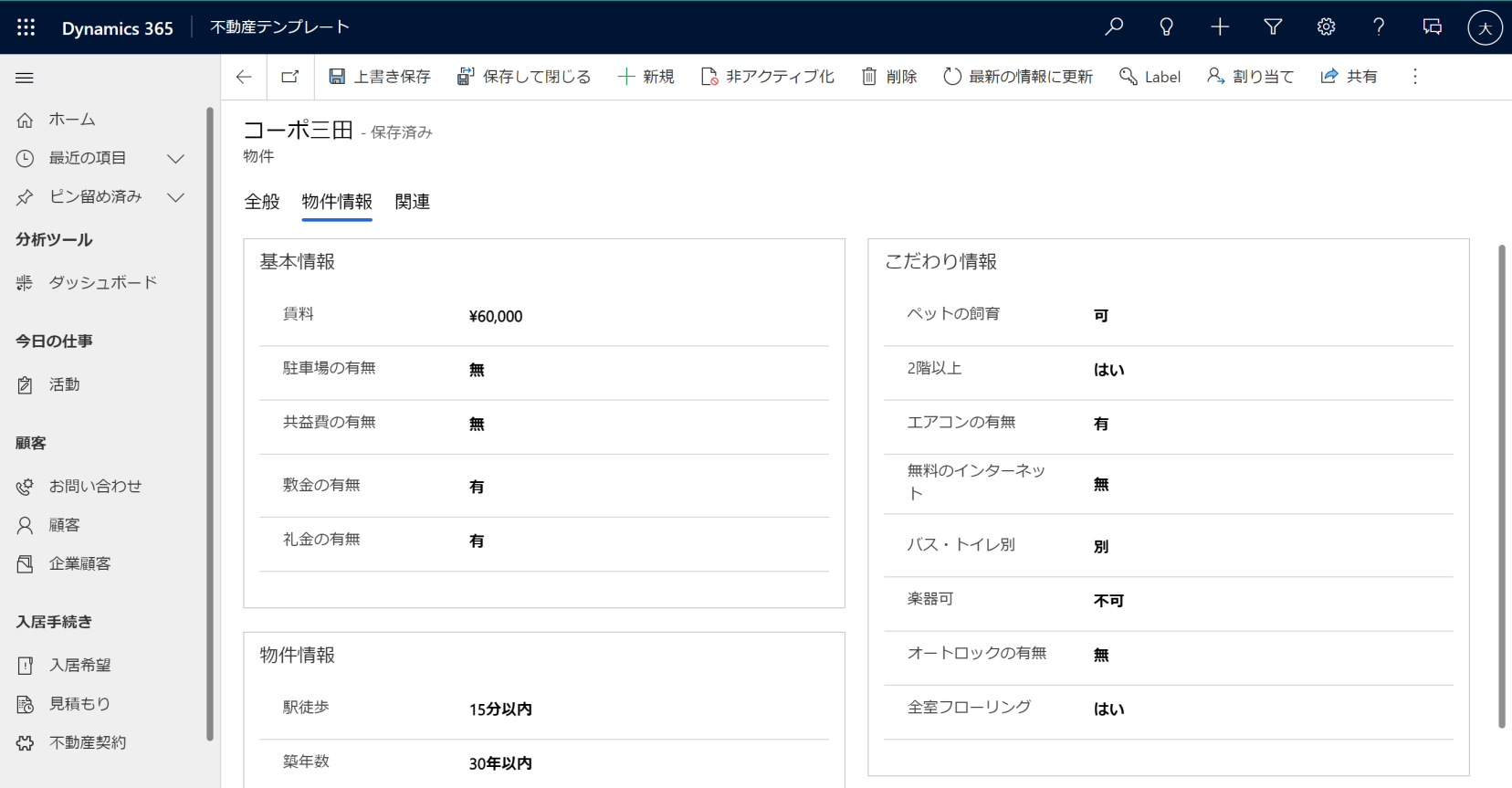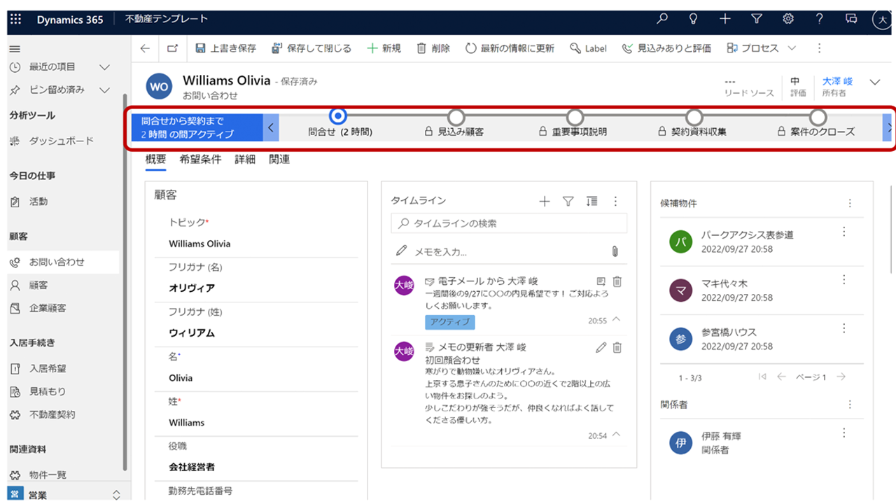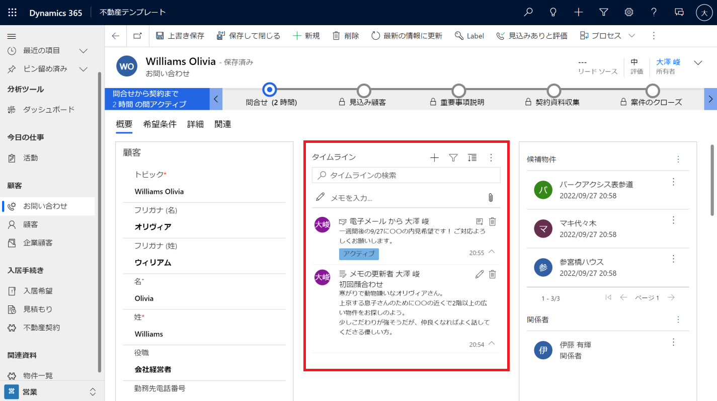 This is a Dynamics-specific solution for real estate brokerages that assumes the use of Dynamics 365 Sales as its CRM platform. Emails and tasks are recorded in association with cases and customers, enabling personalized customer management and supporting sales representatives' daily work.