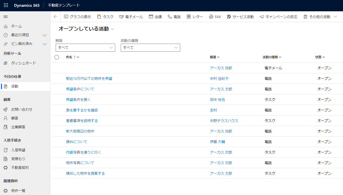 This Dynamics-specific solution for real estate brokerages, designed to use Dynamics 365 Sales as its CRM platform, supports the following tasks from a sales representative's expected daily work. The unique feature of this template is the interaction between each function. For example, emails and tasks are recorded in association with deals and customers, enabling personalized customer management.