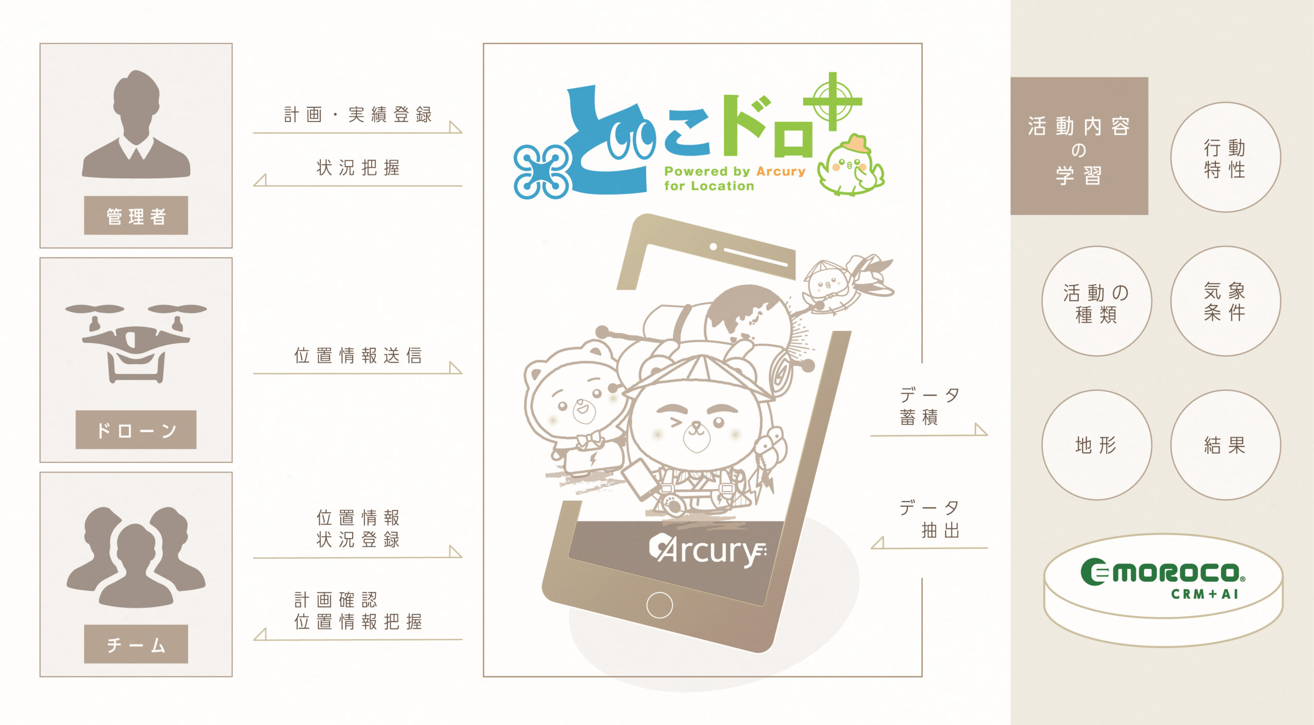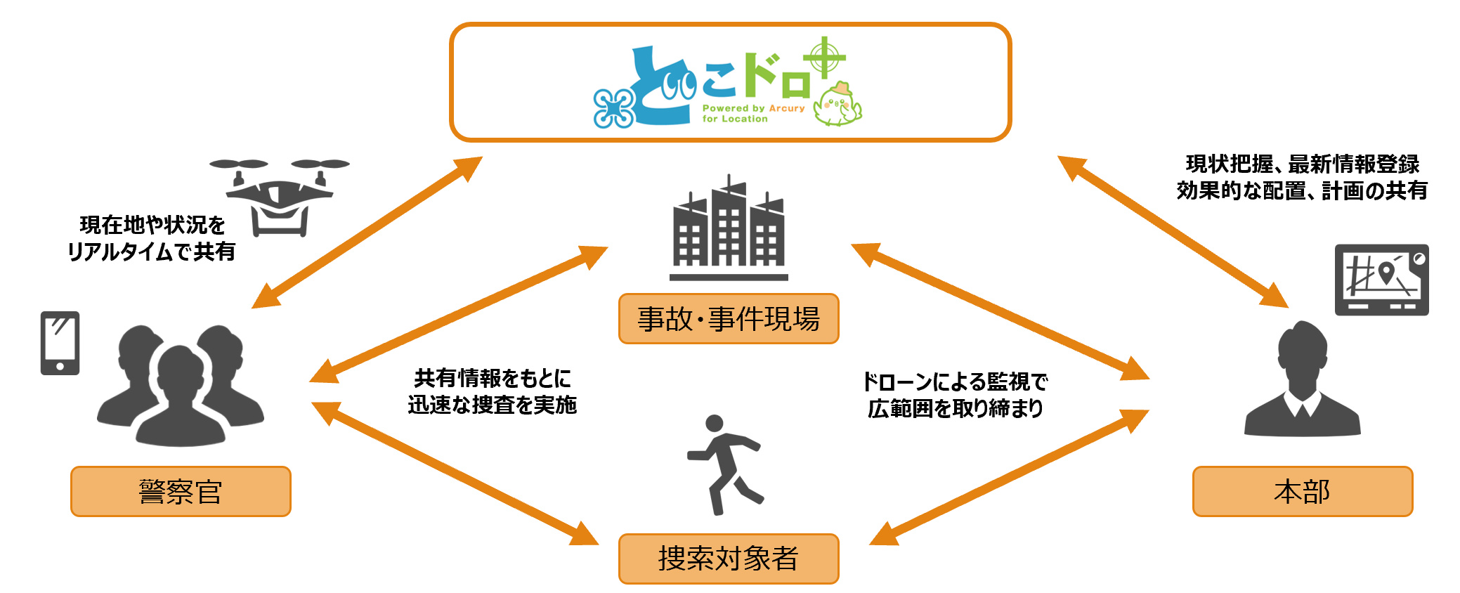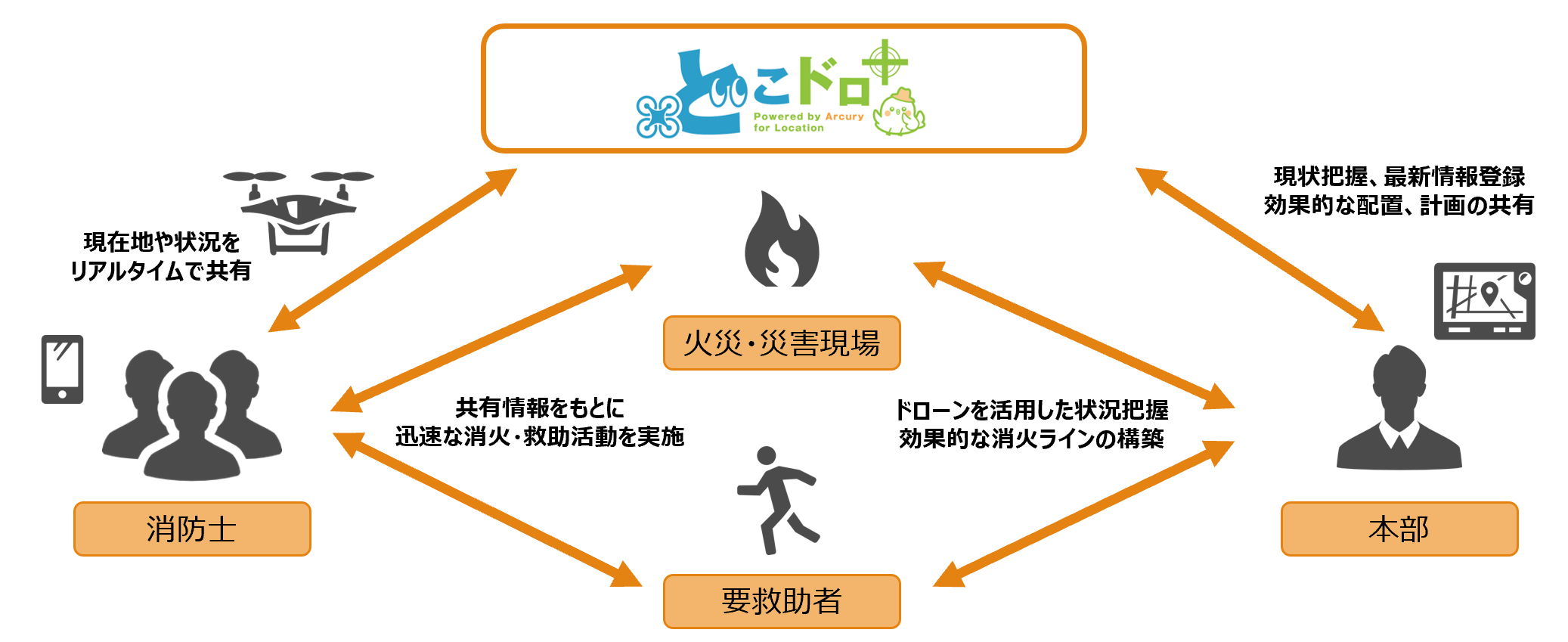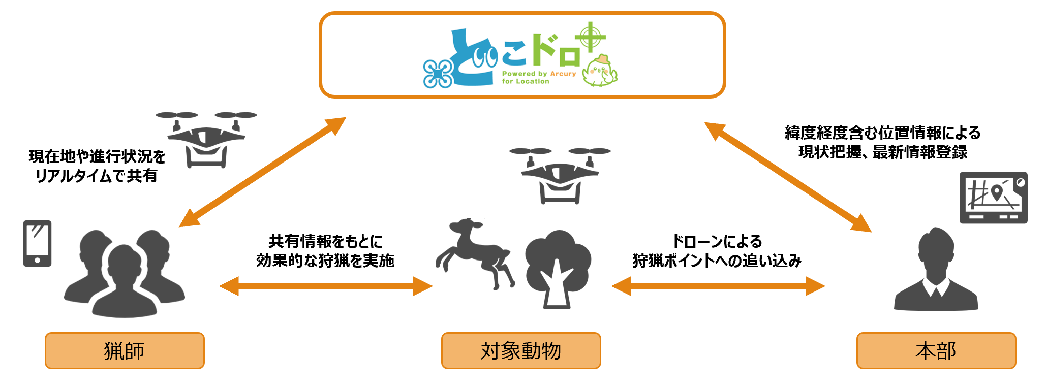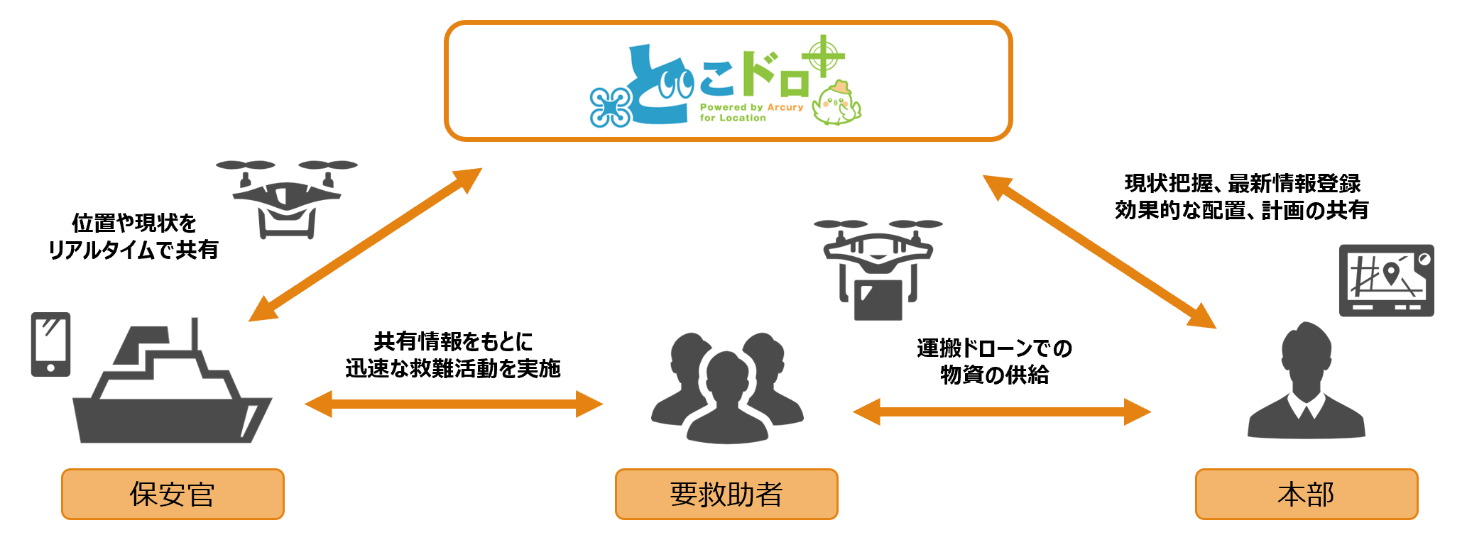 Dokodor+ is a support system (drone location system) that allows you to share the locations of drones and team members in real time. It is easy to install and can be used for a wide range of purposes, from monitoring to disaster response. It connects the field and headquarters from the sky.